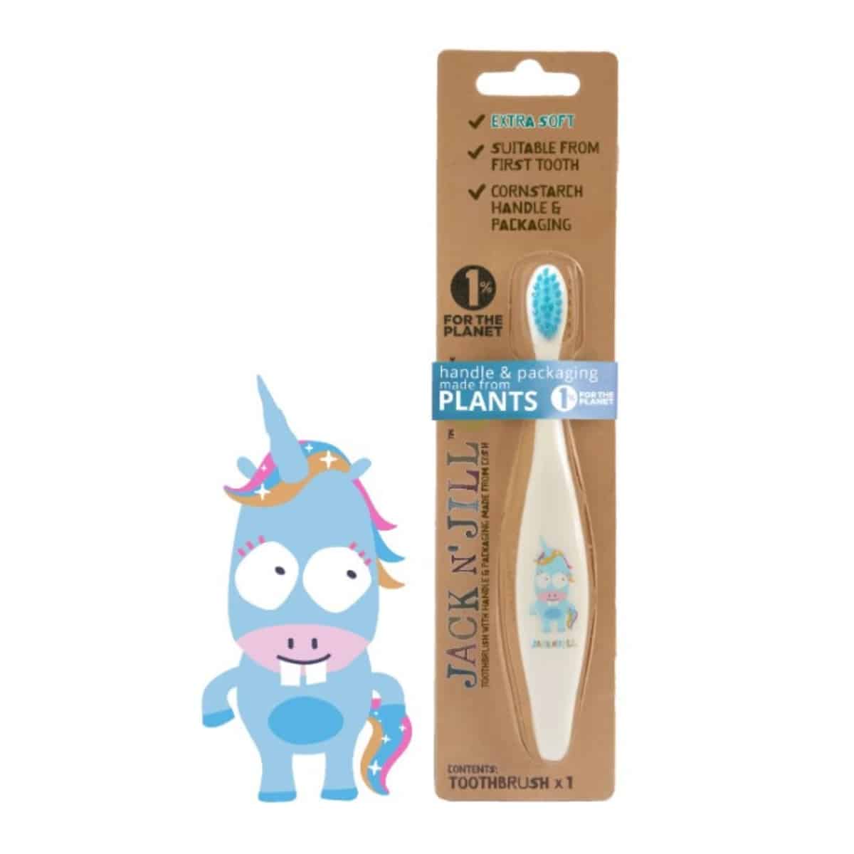 מברשת שיניים לתינקות חד קרן Jack N' Jill מעמילן תירס- חומר צמחי זה ניתן למיחזור וליצירת קומפוסט והשימוש בו מאפשר להימנע משימוש בפלסטיק חד פעמי אשר ממשיך להמיט הרס על הסביבה.