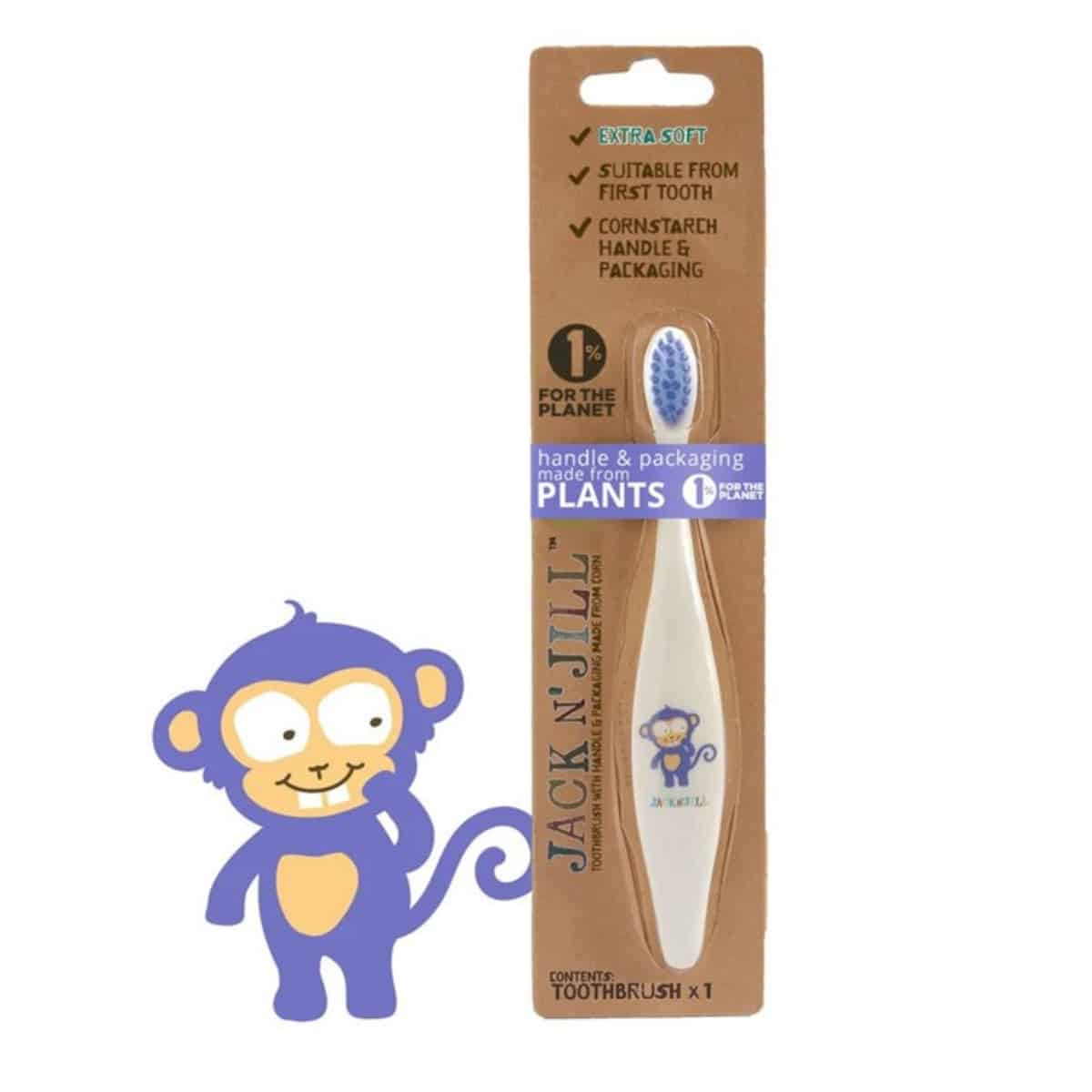 מברשת שיניים לתינקות קופיף Jack N' Jill מעמילן תירס- חומר צמחי זה ניתן למיחזור וליצירת קומפוסט והשימוש בו מאפשר להימנע משימוש בפלסטיק חד פעמי אשר ממשיך להמיט הרס על הסביבה.